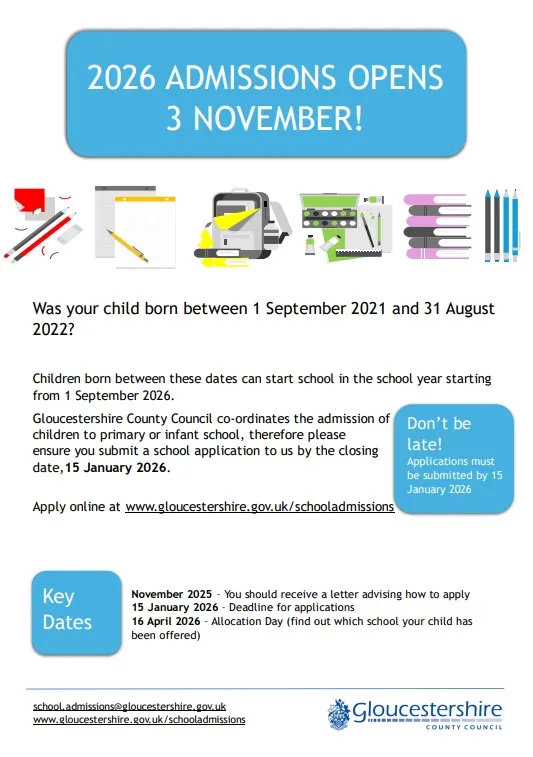 Pupils will be admitted at the beginning of the academic year (1st September) following their 4th birthday, without reference to ability or aptitude (normal admission round). The number of intended admissions for the year commencing September 2025 will be 45. The School Admissions Policy and criteria should be read in conjunction with information available at www.gloucestershire.gov.uk/school admissions. Parents are encouraged to apply online. The link to apply is